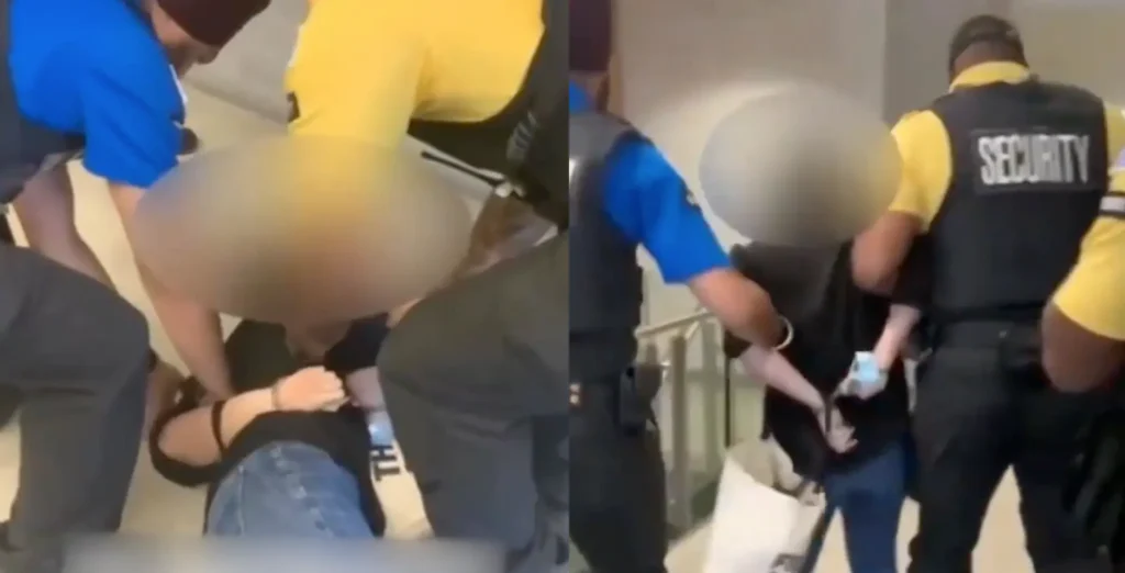 A few moments later, the guard slams her to the ground, while another guard assists to pin her down while they handcuff her.